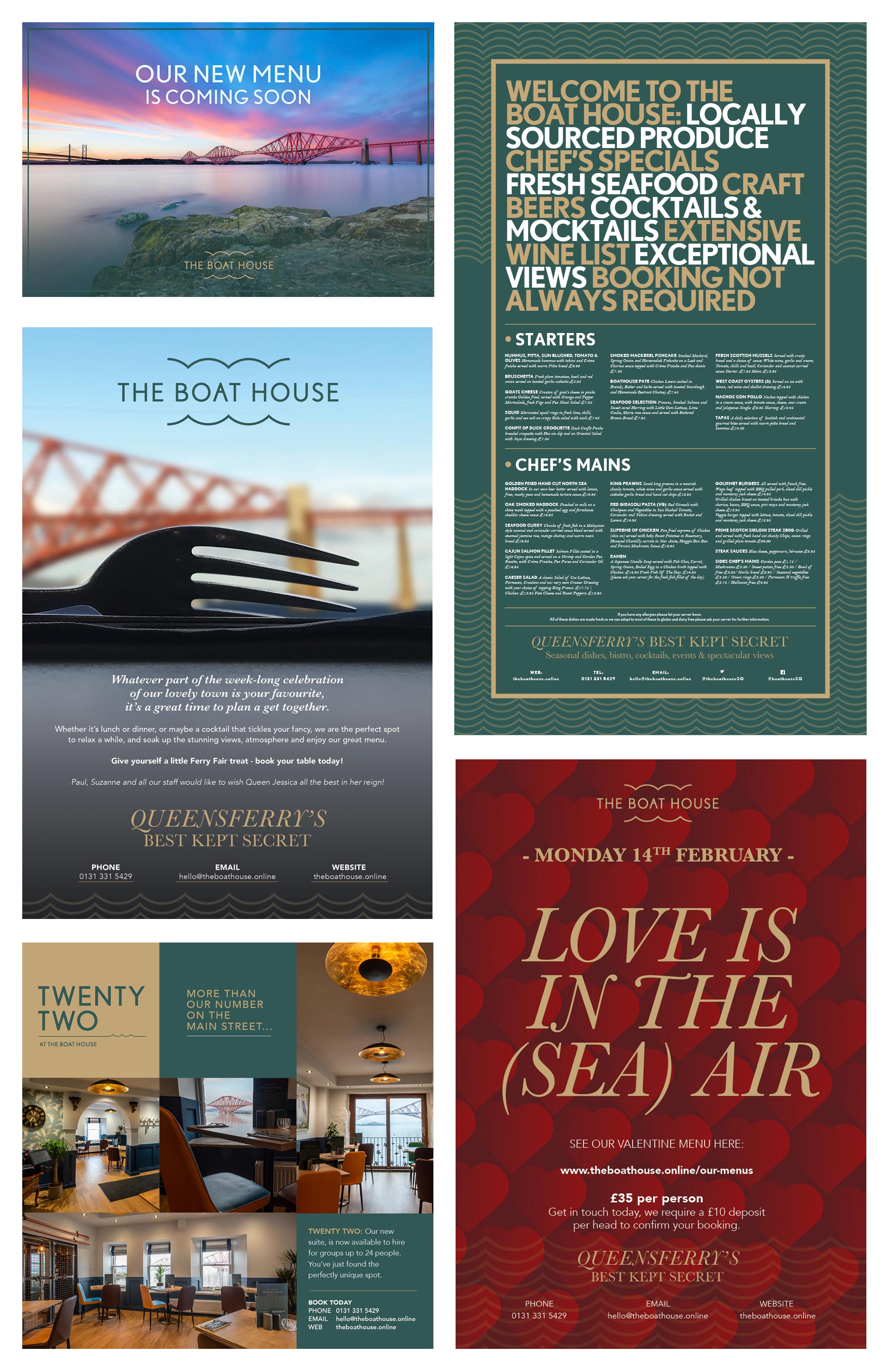 The Boathouse: The Boathouse is a small, independently owned restaurant in Queensferry. We produced a series of adverts for their external light box display, which incorporated the menu, as well as print and digital adverts spotlighting upcoming events and offers.