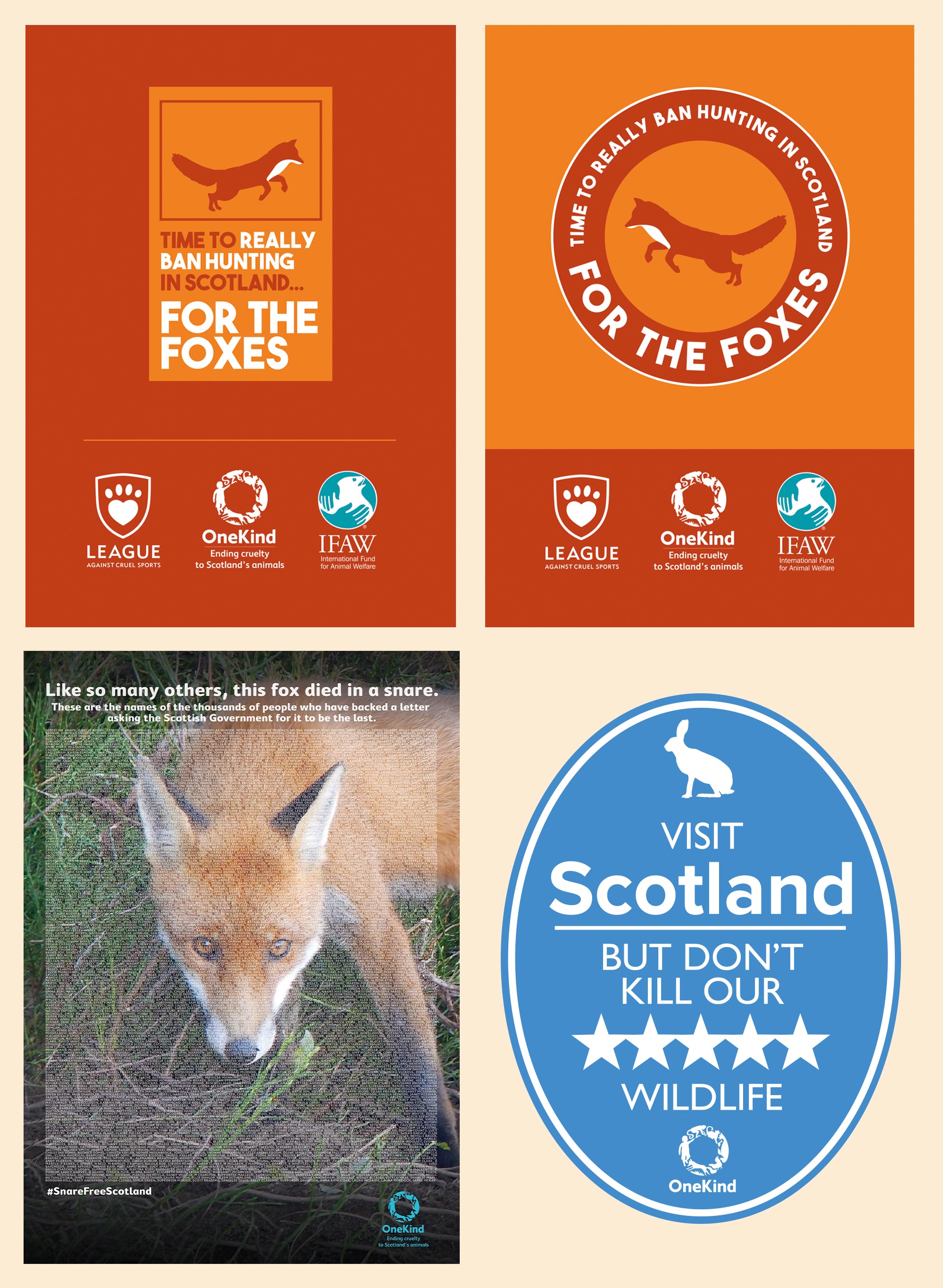 OneKind: We produce various elements for campaigns on banning barbaric practices like fox hunting and snares. The campaign led, in part, to the actual banning of snares in Scotland from November 2024. We also produced a window sticker, which was based on the Visit Scotland version, a way of welcoming visitors to enjoy our spectacular natural resources but without the needless cruelty.
