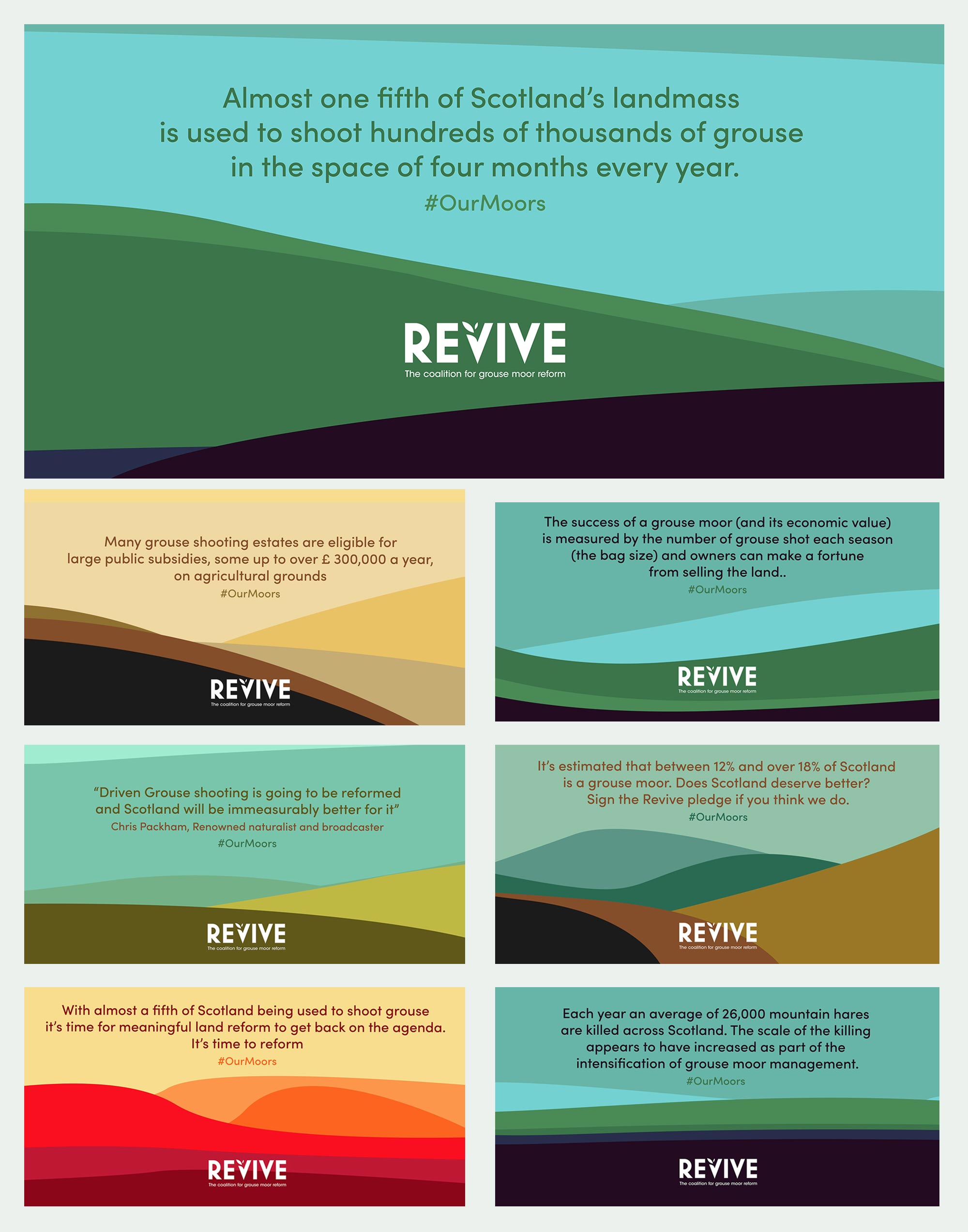 REVIVE: REVIVE is a coalition between Common Weal, Raptor Persecution UK, Friends of the Earth Scotland, OneKind and League Against Cruel Sports campaign for grouse moor reform. The launch of this new campaign featured a highly stylised version of the Scottish landscape, a seeming utopia, alongside the ugly truth about the reality of the hunting and shooting industry.